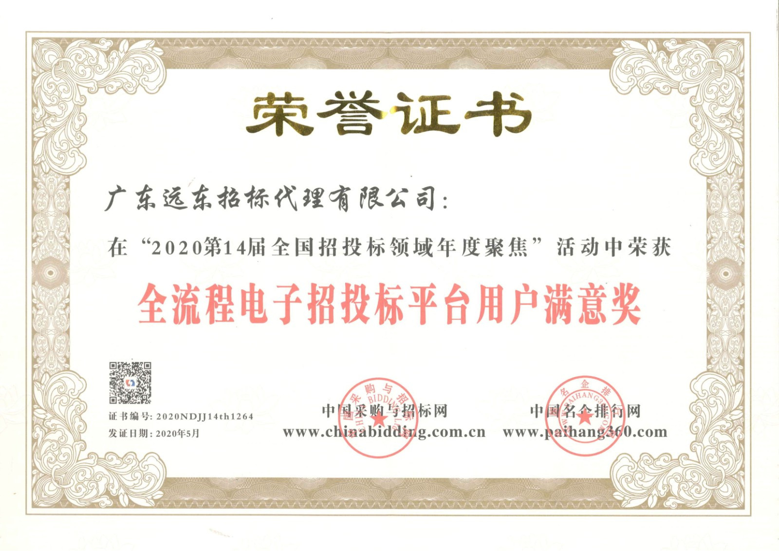 2020全流程電子招投標(biāo)平臺用戶滿意獎